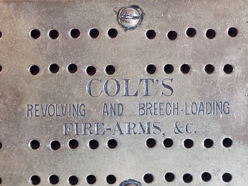 Advertising Brass board for "Colt's Revolving And Breech-Loading Fire-Arms, &C." Also stamped "Telegraph" and "Colt London" All on a oak base with brass stud feet. So rare to find a Colt advertising board with the London embellishment.