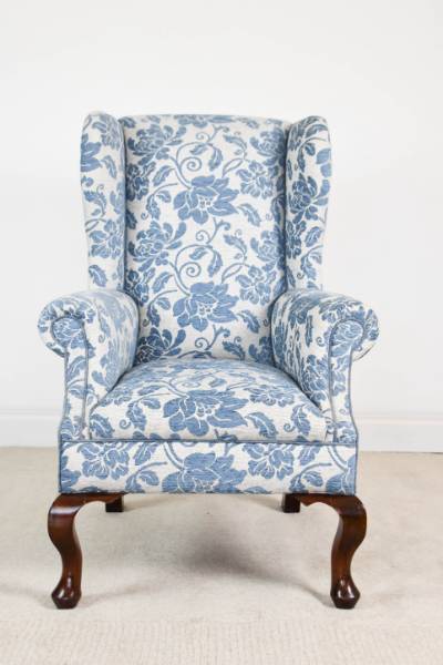 This is a traditionally re-upholstered mahogany wing chair, it has been stripped down to the frame and all new interior, so the chair should be good for another 60 years. The legs are mahogany. The chair is really heavy. The material is contract quality and it is dab off with wet sponge for coffee, wine etc.