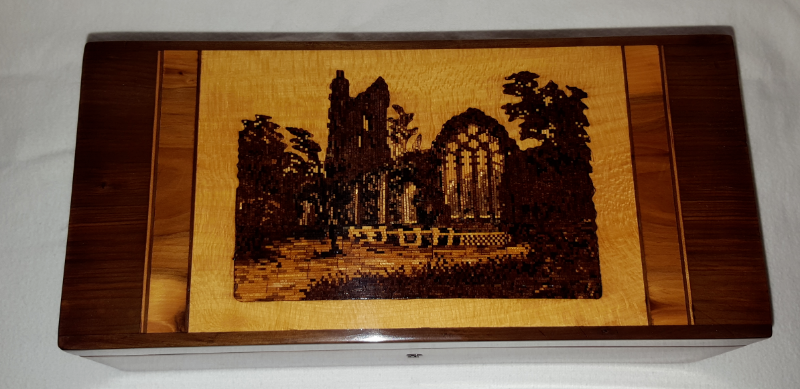An extremely rare crossover piece, this has both Killarney ware and Tunbridge Ware elements. Henry Hollamby sold Tunbridge Ware panels to the Killarney ware makers, so this Muckross Abbey (actually a priory) is made from veneers from the arbutus tree and made in Killarney Ireland. With working key. Probably a glove box.