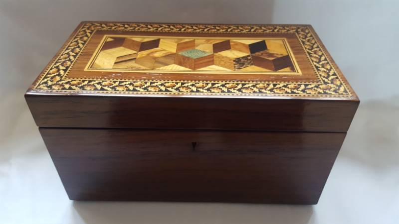 Made by one of the most famous makers of Tunbridge ware Thomas Barton, the original paper label is on the bottom the top has perspective/tumbling cubes and garlands of oak leaves to the border. The rest of the outside is in rosewood veneer. The interior has the original lining to one side and a mixing bowl.